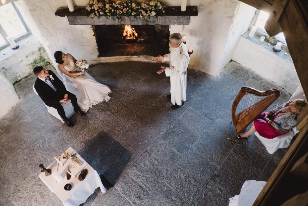 The ceremony took place in Newton Castle, right near the Cliffs of Moher. The tower is a 16th century tower house near the town of Ballyvaughan. It is a unique structure in Ireland, being of cylindrical form with a curious pyramid base. Today the four floors are open to the public, and the occasional wedding. In fact, Waterlily Weddings was the first to produce a wedding at the tower!