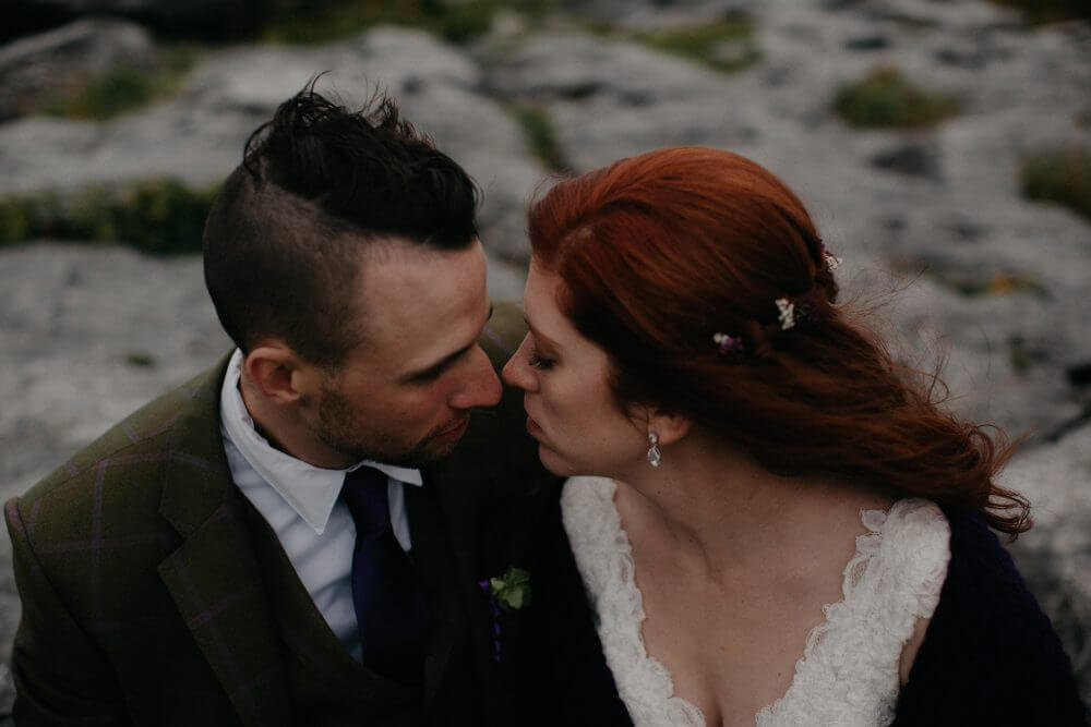 They’re day was cold and dark, much like today’s. The coastal mist creeps up the cliffs’ side to envelope the green hills about, creating a rich, deep dark emerald to match the darkening sapphire blue of the water below. Purple and yellow wildflowers pop out of the grass defiantly, determined to announce that this is in fact a spring day. As I click through the pictures I feel a smile creep up on my face: Sara literally warms every picture with her glorious head of fire red curls and a megawatt smile that lights up every time her eyes meet Jon’s, and Jon can hardly contain his clear love and admiration for his bride. Their intimate wedding will take you on a journey through one of the most beautiful parts of ancient Ireland: through the ruins of a monastery, the expansive textures of the wild Burren, the soaring Cliffs that seem even more mystical and magical as the mist creeps up from the ocean afar, and finally seeking refuge in a cozy pub in Doolin.