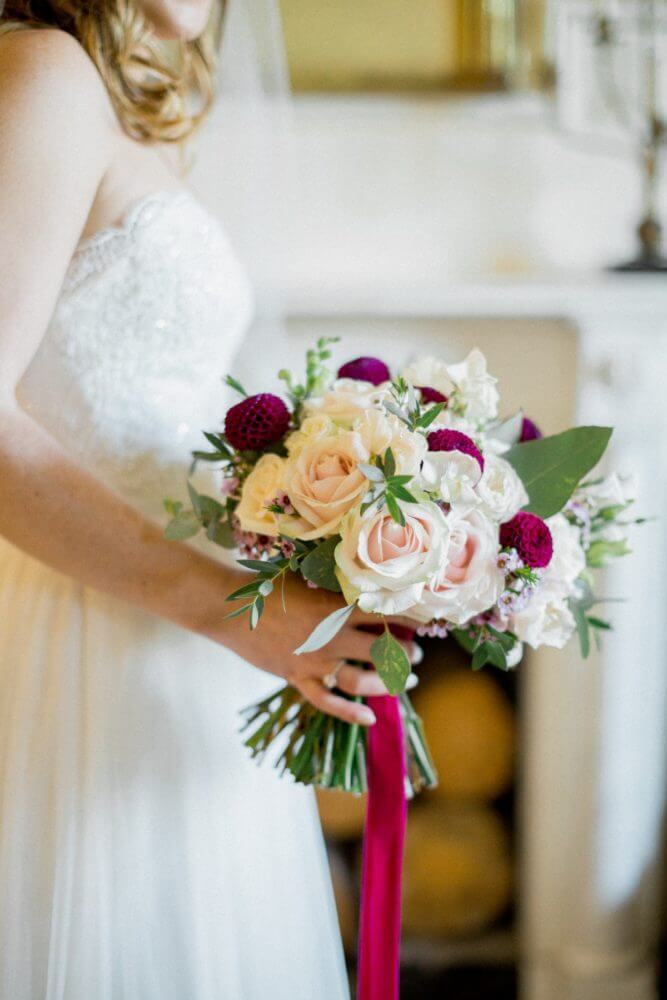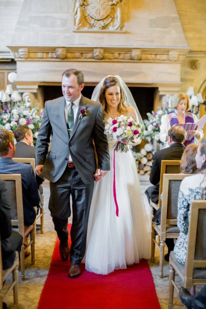 The traditional, spiritual ceremony used the castle’s interior as backdrop with elegant floral arrangements serving as focal point. The ceremony was customized directly around Ben and Liz and their story, and they chose to feature a unity candle custom-crafted for the couple right in Ireland! They wanted to incorporate some Irish traditions into the wedding as well, and chose to include the traditional handfasting ceremony. Liz with Ben’s help created their own gorgeous emerald green-champagne-white chord. “I was determined to make a traditional 4-way braid!” says Liz. The first attempt unfortunately looked gorgeous but ended up way too long, so she went back and this time with Ben’s help. Being the only item that was crafted for the wedding, “I was thrilled with how it turned out and was so happy to have Ben’s help!” she says.