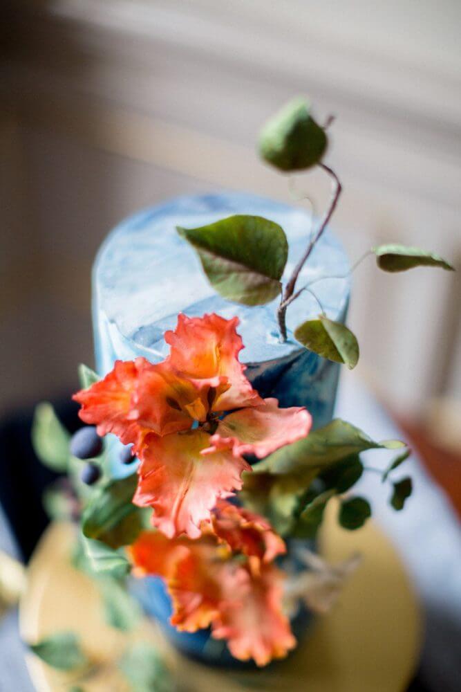 I was heavily inspired by the Queen Fire Tulip and really wanted to feature that exclusively on the cake as a main, stunning focal point. Jen beyond delivered, creating the blue backdrop of the cake to mimic the movement of water being stirred by wind (a nod to Sligo which sits near the coast), and then creating those sugar flower fire tulips based on a picture I gave her. You’ll notice the tulips’ petals are like a flame licking off a candle (hence their name) and the same shape and movement found in fishes’ tails in the cuff links to tie the theme together.
