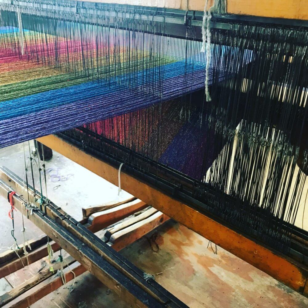 You can see the process of making one colorful blanket. Each yarn was colored and then individually threaded to the heddle then woven in a square plaid style pattern.