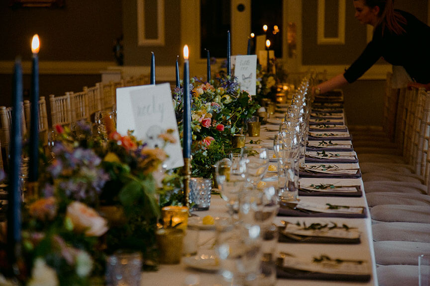 The couple were sent off with wedding bell wands, another fabulous DIY detail made by Dave’s mother we loved about this wedding! The vintage car eventually brought the couple back to Eccles Hotel in Glengariff for their reception, while their guests had been enjoying some cocktails and canapes on the terrace while the sun began its decent into the horizon. A formal 3-course meal was served in a fun, semi-formal setting beautifully appointed with colors and textures of the season. The group “collectively laughed and cried as loved ones spoke words of love, happiness, and the bright future ahead.” After dinner the party started — the group partied to a DJ until the wee hours and glow wands and sticks — finishing with a surprise FIREWORKS show!