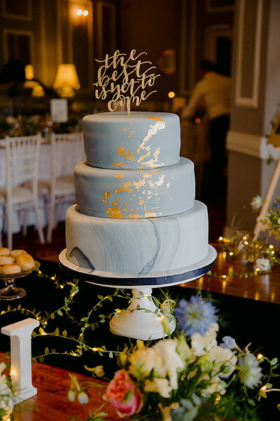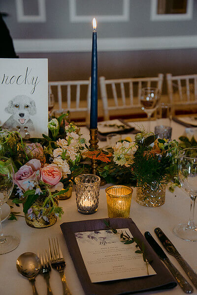 Waterlily Weddings helped Laney and David plan and design their perfect day. We wanted to bring in a lot of seasonality throughout the decor, focusing a color palette on soothing and serene dusty blue and elegant ivory and greenery notes. To accent the color palette, we brought in some soft pink and peach tones into the reception flowers. Luxe navy gave an elegant undertone without feeling heavy or ostentatious, and again drew heavily on the water theme we wanted to represent throughout the day. The cake was designed with a marble effect finish, edible gold leaf detail, and the custom cake topper and L&D decor was brought over by the bride to perfectly accentuate. The space felt so warm and romantic — antique brass candle sticks with navy taper candles and votives in a mix of mercury votives and antique blue glass holders added the perfect accent of texture and color to the tables. A star feature has to be the custom stationary — Laney’s friend Shanae hand painted the table numbers — all based on beloved family pets to add a nod to Laney and Dave’s love for animals. We continued the little pop of personalization with the macaroons — vanilla macaroons were brushed with gold and a paw print sketch design. Finally, we also helped Laney and Dave conceptualize their featured cocktails — Tomcat Collins and Whisker’s Manhattan — that delighted guests throughout the evening.