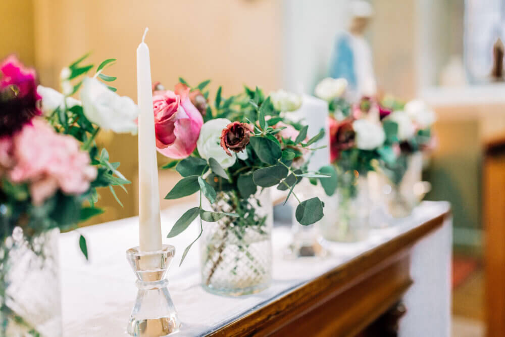 Lisa’s custom color palette was created around dusty rose — a beautiful hue that can tone towards warm or cool palettes and that managed to bring out the still-vibrant greenery of Ireland’s early autumnal season. Sylvia of Bella Botanica created the most incredible bouquets and floral decor for the event. A crowning detail was the sweet floral arch that greeted guests at the church! Everyone looked fantastic, including Lisa who shown in her Matthew Christopher gown and Ronan in his Collar & Cuff suit. The bridesmaids took on the dusty rose hue within their dresses, paired perfectly with soft blush and euclayptus tones in their bouquets.