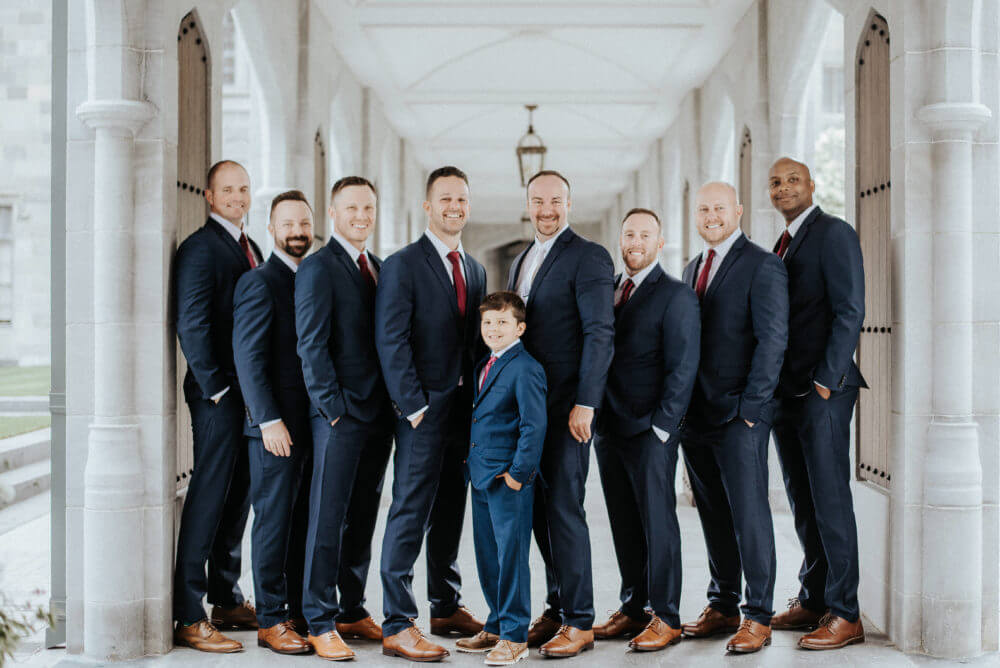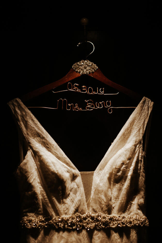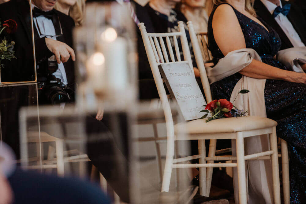 Brittany conceptualized the overall theme and vibe of the day, merging historic castles and Irish ruins with the elegance of the ballroom and gorgeous jewel tones in “royal glam with a flare of bohemian and vintage edge.” She’s a systems engineer specializing in machine learning and AI, specifically in retail and literally wrote a book on the subject (wow!) and used her skills to effect when planning her day! We’re completely in love with the color palette showcasing bold romantic garnet and ruby tones with pops of amethyst, sapphire blue, and romantic ivory. Lots of fresh greenery livened the space and accent of gold elevated the design. Brittany brought in the vintage tones in her look, including her stunning RIVINI gown and custom hand-embroidered and beaded belt that served also as her “something Irish” being made by Magnificence Bridal based in Ireland! Girl – we love a good pair of shoes and her Choos were S-T-U-N-N-I-N-G. But our favorite part has to be her gorgeous Maria Elena headpiece, beautifully echoing the bohemian and regal vibe with Swarovski crystals. Nick looked every part the handsome prince. Their spiritual ceremony was heavily bespoke, an emphasis on their vows that took on the theme of equality and marriage as a partnership. Their son also played an integral part in the day, reading a poem called “An Uncommon Love” and being bearer of the unity candle. Bringing in a touch of Irish tradition via handfasting rounded out the emotional, meaningful wedding ceremony that was beautifully decorated with florals expertly prepared by Frog Prince. One of our favorite details included how Brittany and Nick beautifully honored her late father: she had a locket holding a picture of him so she could have him close the whole day, and saved a special seat during the ceremony — the photo speaks for itself.