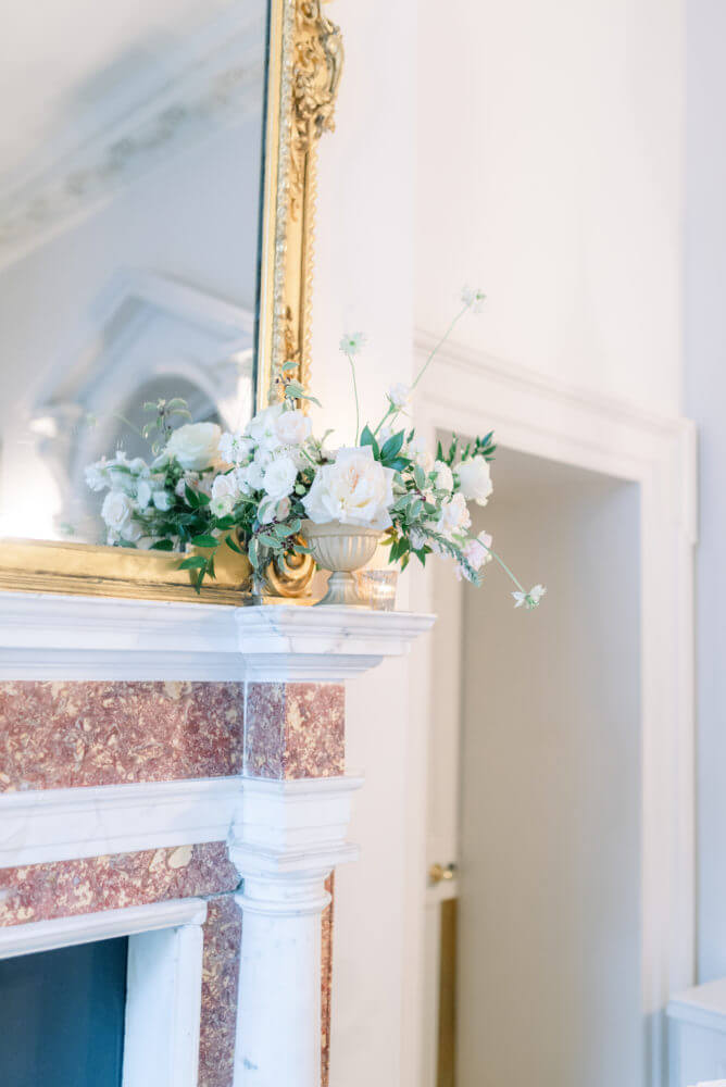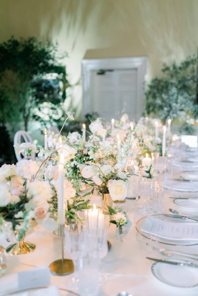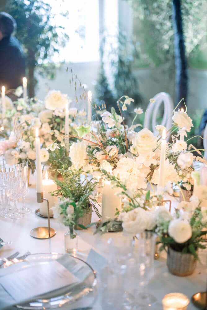 The table setting took the theme again, creating clusters of arrangements from larger compote style spilling out onto the tables to smaller potted ferns and bud and julep vases. Each bloom is carefully curated for its color, size, but most importantly — it’s shape– for this effect to work. You want a mix of height and lots and lots of texture, but you want to retain the integrity of a naturally-growing floral. Accenting with beautiful classic Irish crystal and gold and silver elements with clean white candles really took this look to the next level of elegant garden theme.