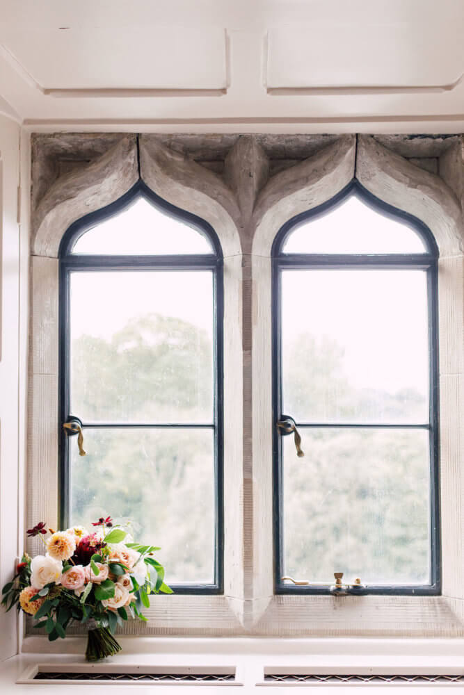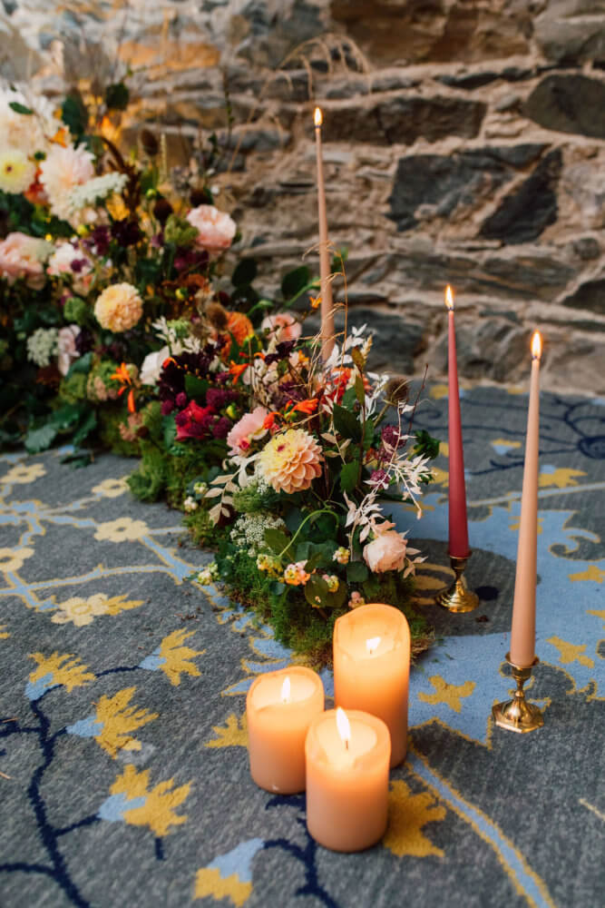Waterlily Weddings collaborated with Toronto based photographer Rose Gold Productions for this shoot. Rose Gold wanted to merge rustic with elegant in a castle setting: the juxtaposition of fruits and vegetables on the tablescape with polished gold cutlery and calligraphy struck that balance for this castle feast vibe. Kilkea Castle serves as venue backdrop, the imposing 12th century style castle instantly drives a classic or fairytale wedding theme. But when working in a more modern color palette, you can see how it can add a modern take on the timeless look that reads effortlessly romantic. Rich and detailed color palettes are a sophisticated way to express your details. In this style shoot, we merge neutral tones like soft peach, ivory, delicacy pink and sandstone and merge them with bolder hues of royal blue, topaz yellow, emerald green, and claret red. The depth of color is incredible and at once visually engaging and inviting.