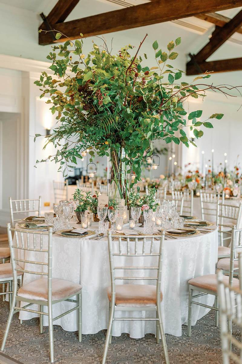 We began our planning with our styling services, and focused on a seasonal color palette that took inspiration from the early autumn season but that also felt timeless and elegant. We played with lots of green tones and accented with warmer browns like cinnamon, ochre, penny, and copper tones to hit that early fall vibe but in an elegant way. Patsie absolutely nailed the color palette in the floral expressions down to each leaf;  we wanted to highlight textures, woodland, and garden details without feeling heavy and jungly. The stunning greenery centerpieces featured hanging tealights which added a soft glow into the evening. And touches of dark green candles were an unexpted modern pop on the tables. We continued accents of gold in the charger plates and kept a more traditional style for table cloths, napkins, and glassware to really swing the rustic tones in Hunters Yard more traditional and elegant. It worked beautifully. Finishing touches included custom menus by Appleberry Atelier (based in Ireland).