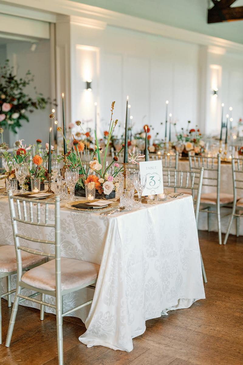 We began our planning with our styling services, and focused on a seasonal color palette that took inspiration from the early autumn season but that also felt timeless and elegant. We played with lots of green tones and accented with warmer browns like cinnamon, ochre, penny, and copper tones to hit that early fall vibe but in an elegant way. Patsie absolutely nailed the color palette in the floral expressions down to each leaf; we wanted to highlight textures, woodland, and garden details without feeling heavy and jungly. The stunning greenery centerpieces featured hanging tealights which added a soft glow into the evening. And touches of dark green candles were an unexpted modern pop on the tables. We continued accents of gold in the charger plates and kept a more traditional style for table cloths, napkins, and glassware to really swing the rustic tones in Hunters Yard more traditional and elegant. It worked beautifully. Finishing touches included custom menus by Appleberry Atelier (based in Ireland).