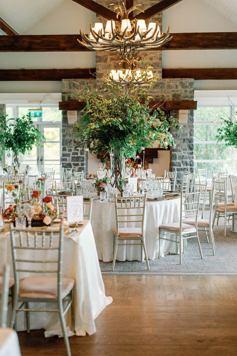 We began our planning with our styling services, and focused on a seasonal color palette that took inspiration from the early autumn season but that also felt timeless and elegant. We played with lots of green tones and accented with warmer browns like cinnamon, ochre, penny, and copper tones to hit that early fall vibe but in an elegant way. Patsie absolutely nailed the color palette in the floral expressions down to each leaf; we wanted to highlight textures, woodland, and garden details without feeling heavy and jungly. The stunning greenery centerpieces featured hanging tealights which added a soft glow into the evening. And touches of dark green candles were an unexpted modern pop on the tables. We continued accents of gold in the charger plates and kept a more traditional style for table cloths, napkins, and glassware to really swing the rustic tones in Hunters Yard more traditional and elegant. It worked beautifully. Finishing touches included custom menus by Appleberry Atelier (based in Ireland).