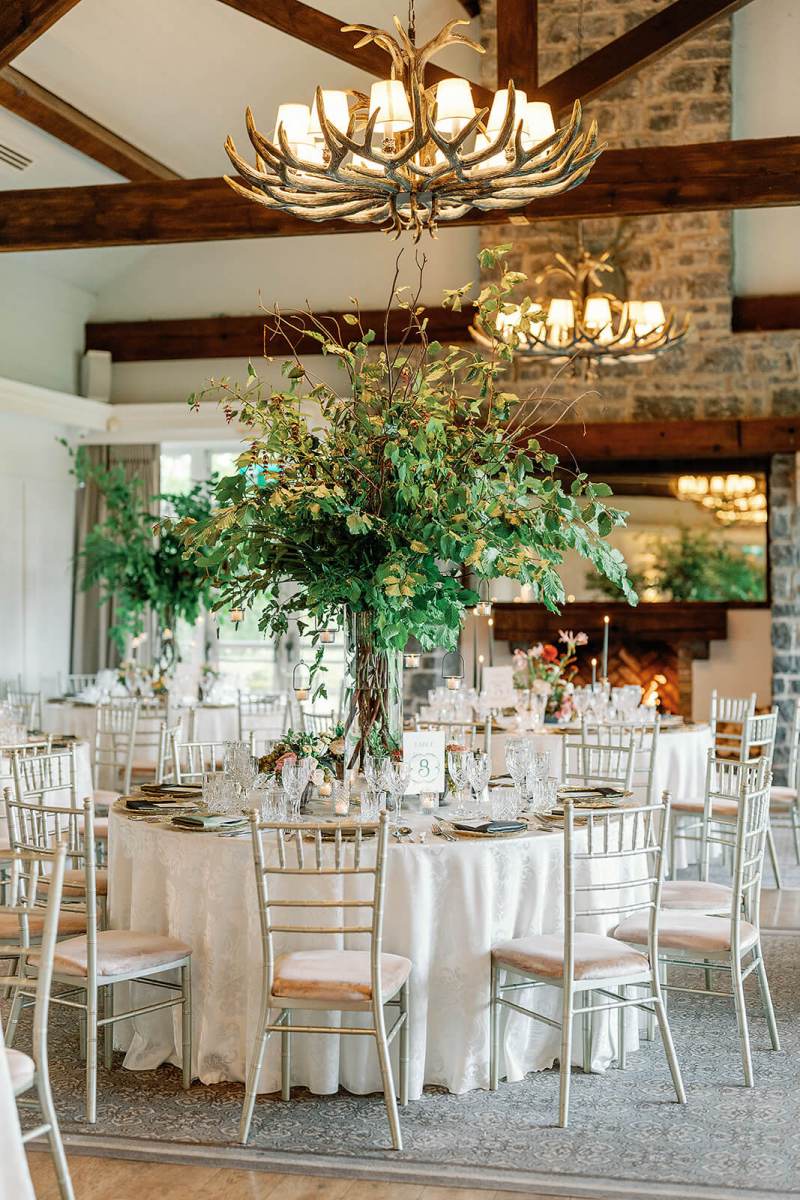 We began our planning with our styling services, and focused on a seasonal color palette that took inspiration from the early autumn season but that also felt timeless and elegant. We played with lots of green tones and accented with warmer browns like cinnamon, ochre, penny, and copper tones to hit that early fall vibe but in an elegant way. Patsie absolutely nailed the color palette in the floral expressions down to each leaf; we wanted to highlight textures, woodland, and garden details without feeling heavy and jungly. The stunning greenery centerpieces featured hanging tealights which added a soft glow into the evening. And touches of dark green candles were an unexpted modern pop on the tables. We continued accents of gold in the charger plates and kept a more traditional style for table cloths, napkins, and glassware to really swing the rustic tones in Hunters Yard more traditional and elegant. It worked beautifully. Finishing touches included custom menus by Appleberry Atelier (based in Ireland).
