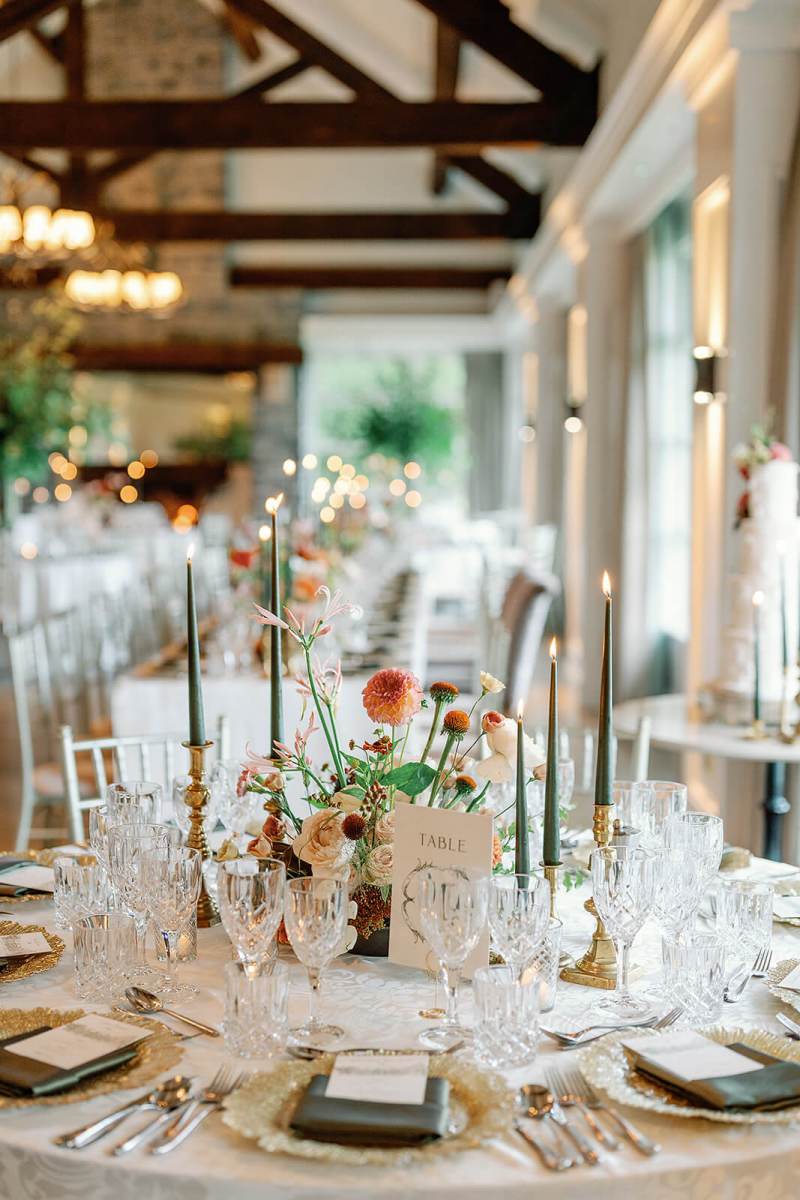 We began our planning with our styling services, and focused on a seasonal color palette that took inspiration from the early autumn season but that also felt timeless and elegant. We played with lots of green tones and accented with warmer browns like cinnamon, ochre, penny, and copper tones to hit that early fall vibe but in an elegant way. Patsie absolutely nailed the color palette in the floral expressions down to each leaf;  we wanted to highlight textures, woodland, and garden details without feeling heavy and jungly. The stunning greenery centerpieces featured hanging tealights which added a soft glow into the evening. And touches of dark green candles were an unexpted modern pop on the tables. We continued accents of gold in the charger plates and kept a more traditional style for table cloths, napkins, and glassware to really swing the rustic tones in Hunters Yard more traditional and elegant. It worked beautifully. Finishing touches included custom menus by Appleberry Atelier (based in Ireland).