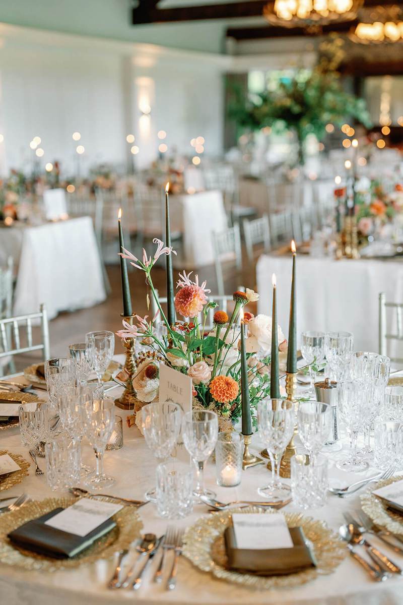 We began our planning with our styling services, and focused on a seasonal color palette that took inspiration from the early autumn season but that also felt timeless and elegant. We played with lots of green tones and accented with warmer browns like cinnamon, ochre, penny, and copper tones to hit that early fall vibe but in an elegant way. Patsie absolutely nailed the color palette in the floral expressions down to each leaf; we wanted to highlight textures, woodland, and garden details without feeling heavy and jungly. The stunning greenery centerpieces featured hanging tealights which added a soft glow into the evening. And touches of dark green candles were an unexpted modern pop on the tables. We continued accents of gold in the charger plates and kept a more traditional style for table cloths, napkins, and glassware to really swing the rustic tones in Hunters Yard more traditional and elegant. It worked beautifully. Finishing touches included custom menus by Appleberry Atelier (based in Ireland).