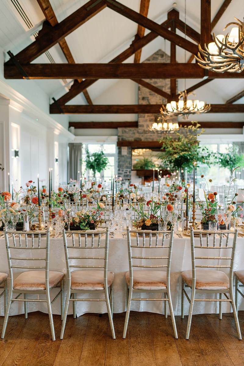 We began our planning with our styling services, and focused on a seasonal color palette that took inspiration from the early autumn season but that also felt timeless and elegant. We played with lots of green tones and accented with warmer browns like cinnamon, ochre, penny, and copper tones to hit that early fall vibe but in an elegant way. Patsie absolutely nailed the color palette in the floral expressions down to each leaf;  we wanted to highlight textures, woodland, and garden details without feeling heavy and jungly. The stunning greenery centerpieces featured hanging tealights which added a soft glow into the evening. And touches of dark green candles were an unexpted modern pop on the tables. We continued accents of gold in the charger plates and kept a more traditional style for table cloths, napkins, and glassware to really swing the rustic tones in Hunters Yard more traditional and elegant. It worked beautifully. Finishing touches included custom menus by Appleberry Atelier (based in Ireland).