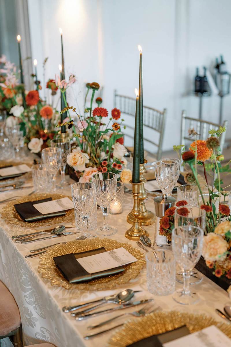 We began our planning with our styling services, and focused on a seasonal color palette that took inspiration from the early autumn season but that also felt timeless and elegant. We played with lots of green tones and accented with warmer browns like cinnamon, ochre, penny, and copper tones to hit that early fall vibe but in an elegant way. Patsie absolutely nailed the color palette in the floral expressions down to each leaf;  we wanted to highlight textures, woodland, and garden details without feeling heavy and jungly. The stunning greenery centerpieces featured hanging tealights which added a soft glow into the evening. And touches of dark green candles were an unexpted modern pop on the tables. We continued accents of gold in the charger plates and kept a more traditional style for table cloths, napkins, and glassware to really swing the rustic tones in Hunters Yard more traditional and elegant. It worked beautifully. Finishing touches included custom menus by Appleberry Atelier (based in Ireland).