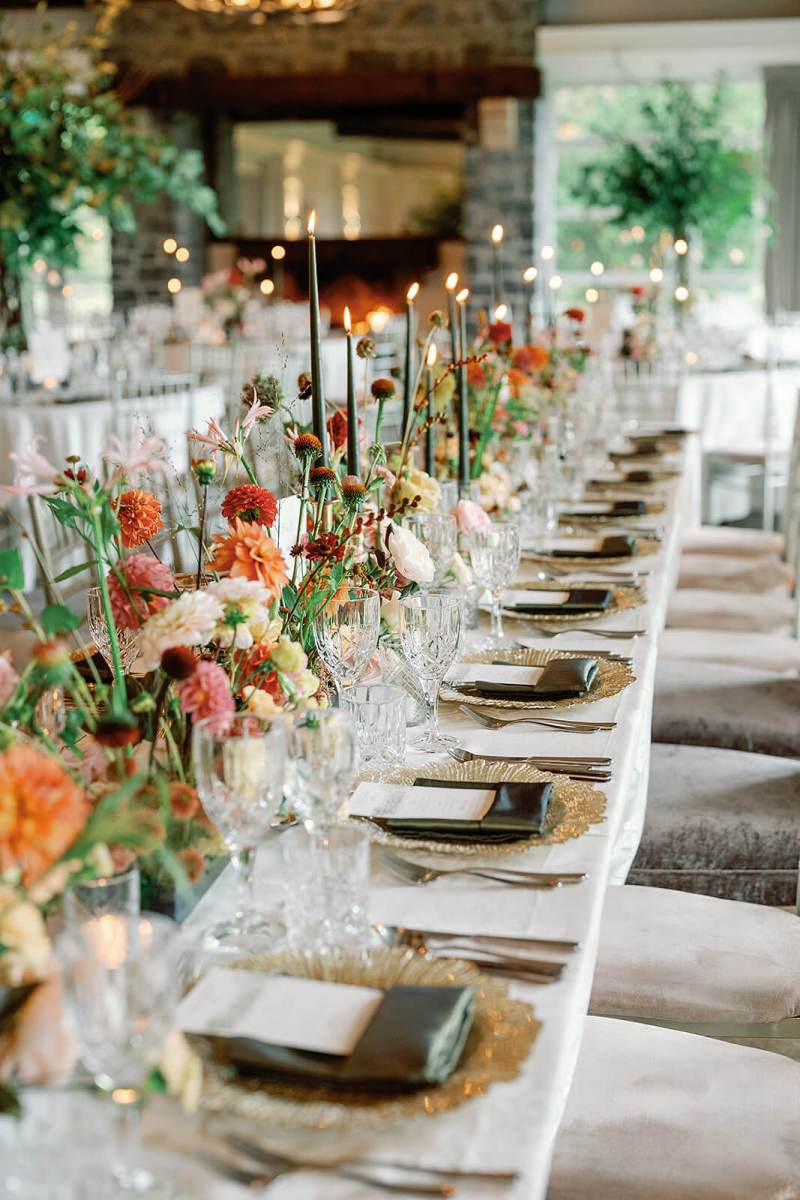 We began our planning with our styling services, and focused on a seasonal color palette that took inspiration from the early autumn season but that also felt timeless and elegant. We played with lots of green tones and accented with warmer browns like cinnamon, ochre, penny, and copper tones to hit that early fall vibe but in an elegant way. Patsie absolutely nailed the color palette in the floral expressions down to each leaf;  we wanted to highlight textures, woodland, and garden details without feeling heavy and jungly. The stunning greenery centerpieces featured hanging tealights which added a soft glow into the evening. And touches of dark green candles were an unexpted modern pop on the tables. We continued accents of gold in the charger plates and kept a more traditional style for table cloths, napkins, and glassware to really swing the rustic tones in Hunters Yard more traditional and elegant. It worked beautifully. Finishing touches included custom menus by Appleberry Atelier (based in Ireland).
