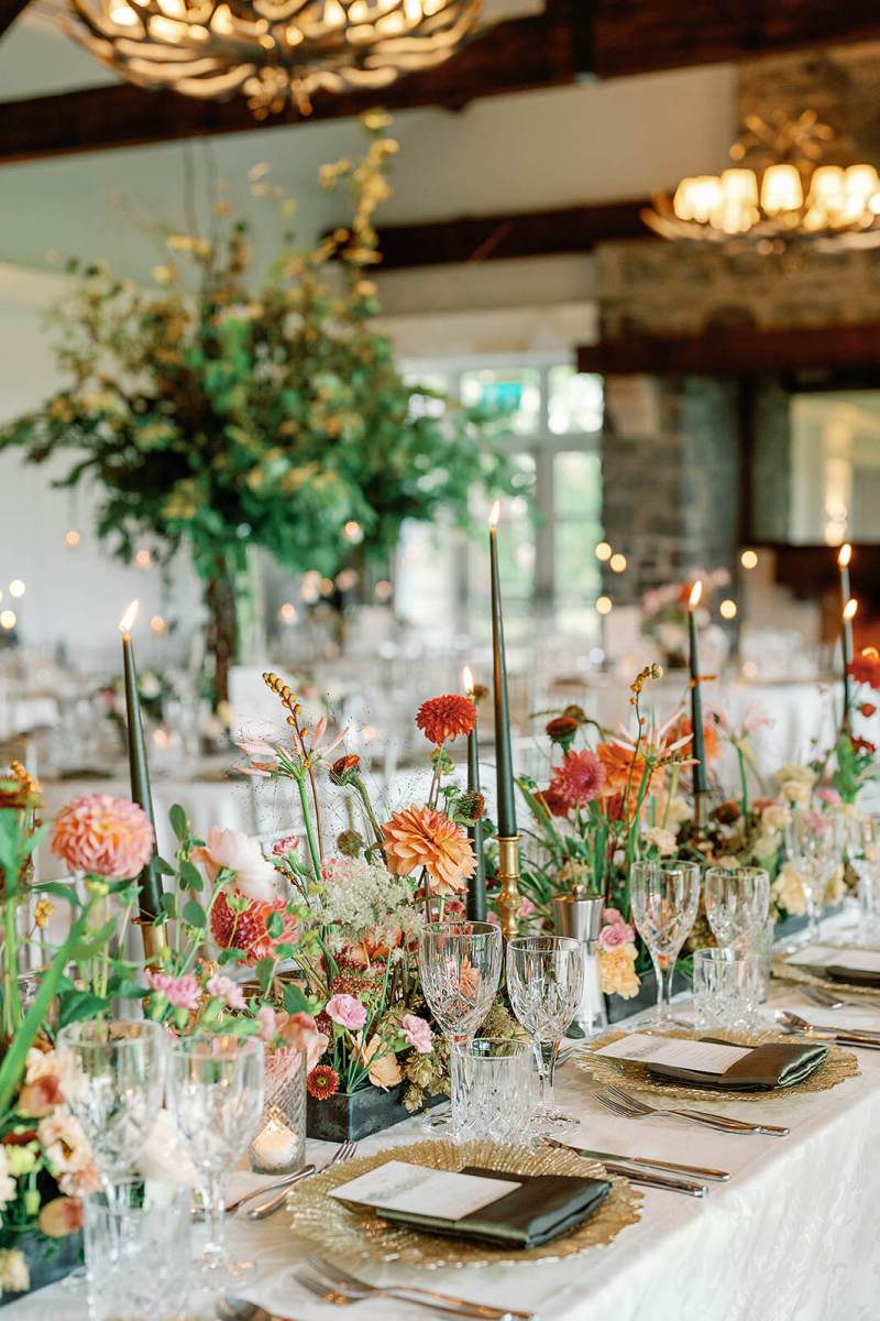 We began our planning with our styling services, and focused on a seasonal color palette that took inspiration from the early autumn season but that also felt timeless and elegant. We played with lots of green tones and accented with warmer browns like cinnamon, ochre, penny, and copper tones to hit that early fall vibe but in an elegant way. Patsie absolutely nailed the color palette in the floral expressions down to each leaf;  we wanted to highlight textures, woodland, and garden details without feeling heavy and jungly. The stunning greenery centerpieces featured hanging tealights which added a soft glow into the evening. And touches of dark green candles were an unexpted modern pop on the tables. We continued accents of gold in the charger plates and kept a more traditional style for table cloths, napkins, and glassware to really swing the rustic tones in Hunters Yard more traditional and elegant. It worked beautifully. Finishing touches included custom menus by Appleberry Atelier (based in Ireland).