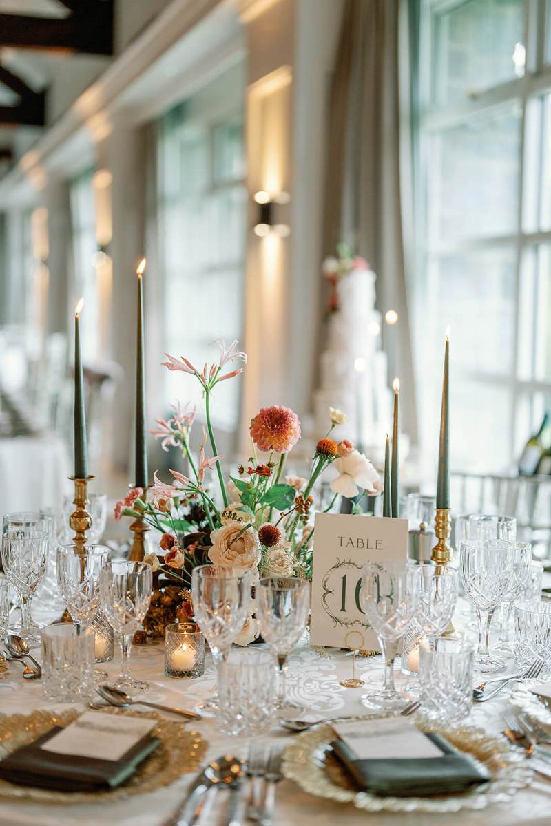 We began our planning with our styling services, and focused on a seasonal color palette that took inspiration from the early autumn season but that also felt timeless and elegant. We played with lots of green tones and accented with warmer browns like cinnamon, ochre, penny, and copper tones to hit that early fall vibe but in an elegant way. Patsie absolutely nailed the color palette in the floral expressions down to each leaf;  we wanted to highlight textures, woodland, and garden details without feeling heavy and jungly. The stunning greenery centerpieces featured hanging tealights which added a soft glow into the evening. And touches of dark green candles were an unexpted modern pop on the tables. We continued accents of gold in the charger plates and kept a more traditional style for table cloths, napkins, and glassware to really swing the rustic tones in Hunters Yard more traditional and elegant. It worked beautifully. Finishing touches included custom menus by Appleberry Atelier (based in Ireland).