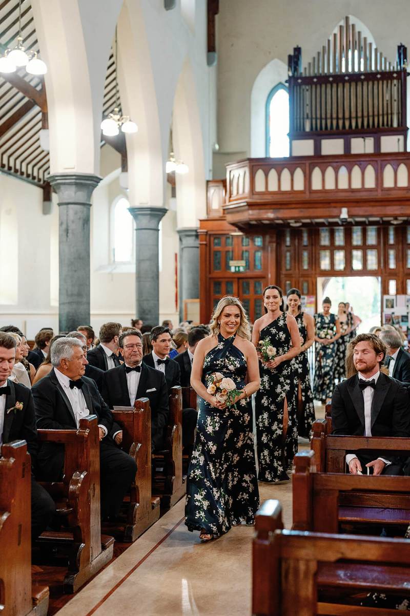 Mary Claire and Andres were stunning in their personal looks. And we love how the bridesmaids took a summer vibe in this early-fall/end-summer wedding with their floral dresses. It was a perfect bridge and worked beautifully with the color palette and overall style of the day!