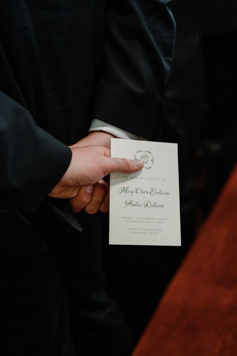 We began our planning with our styling services, and focused on a seasonal color palette that took inspiration from the early autumn season but that also felt timeless and elegant. We played with lots of green tones and accented with warmer browns like cinnamon, ochre, penny, and copper tones to hit that early fall vibe but in an elegant way. Patsie absolutely nailed the color palette in the floral expressions down to each leaf;  we wanted to highlight textures, woodland, and garden details without feeling heavy and jungly. The stunning greenery centerpieces featured hanging tealights which added a soft glow into the evening. And touches of dark green candles were an unexpted modern pop on the tables. We continued accents of gold in the charger plates and kept a more traditional style for table cloths, napkins, and glassware to really swing the rustic tones in Hunters Yard more traditional and elegant. It worked beautifully. Finishing touches included custom menus by Appleberry Atelier (based in Ireland).