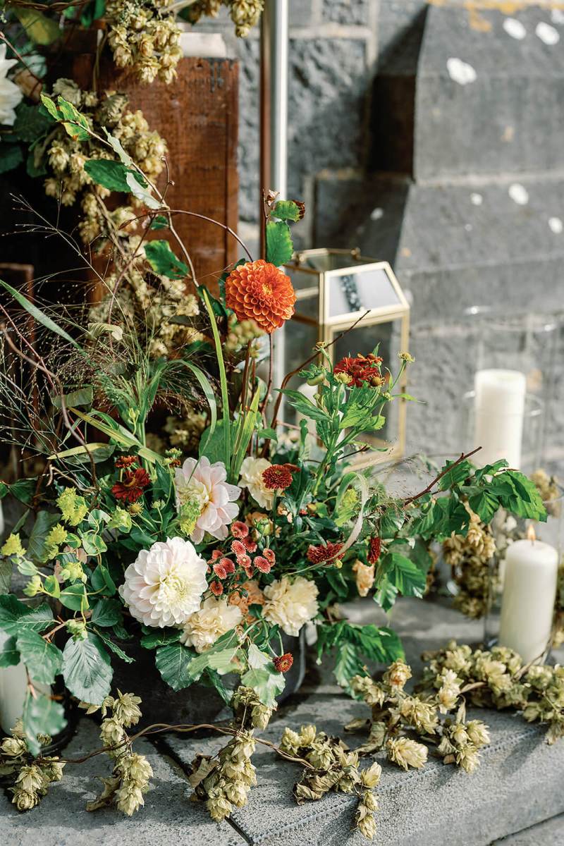 We began our planning with our styling services, and focused on a seasonal color palette that took inspiration from the early autumn season but that also felt timeless and elegant. We played with lots of green tones and accented with warmer browns like cinnamon, ochre, penny, and copper tones to hit that early fall vibe but in an elegant way. Patsie absolutely nailed the color palette in the floral expressions down to each leaf;  we wanted to highlight textures, woodland, and garden details without feeling heavy and jungly. The stunning greenery centerpieces featured hanging tealights which added a soft glow into the evening. And touches of dark green candles were an unexpted modern pop on the tables. We continued accents of gold in the charger plates and kept a more traditional style for table cloths, napkins, and glassware to really swing the rustic tones in Hunters Yard more traditional and elegant. It worked beautifully. Finishing touches included custom menus by Appleberry Atelier (based in Ireland).